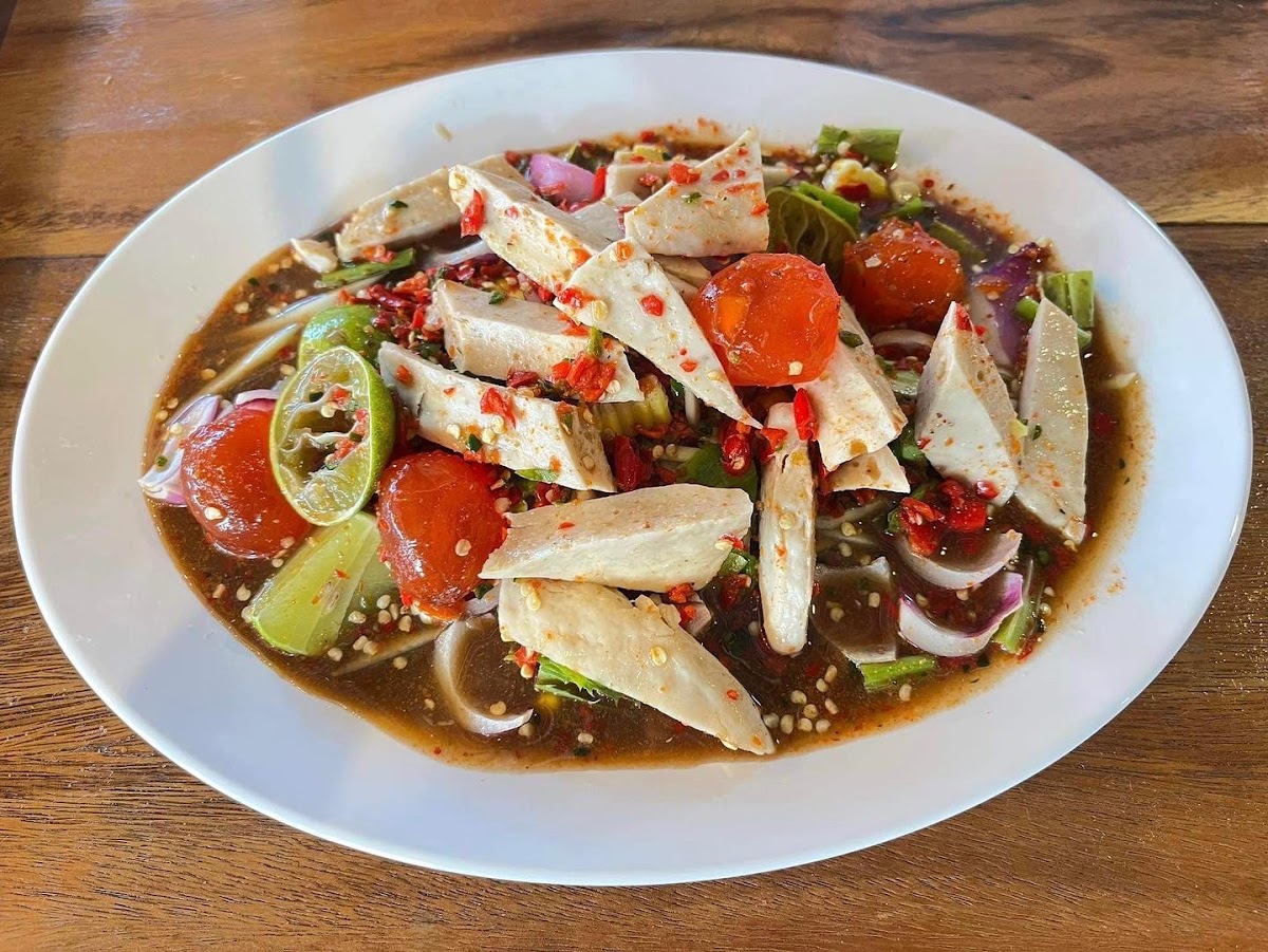 Another must-try is the Fried Tofu, which comes highly recommended at 85 THB, noted for its delightful crispiness that complements a rich dipping sauce. For those craving meat, the Nahm Tok Moo (spicy grilled pork salad), priced at 120 THB, serves as a robust option that satisfies even the heartiest of appetites.